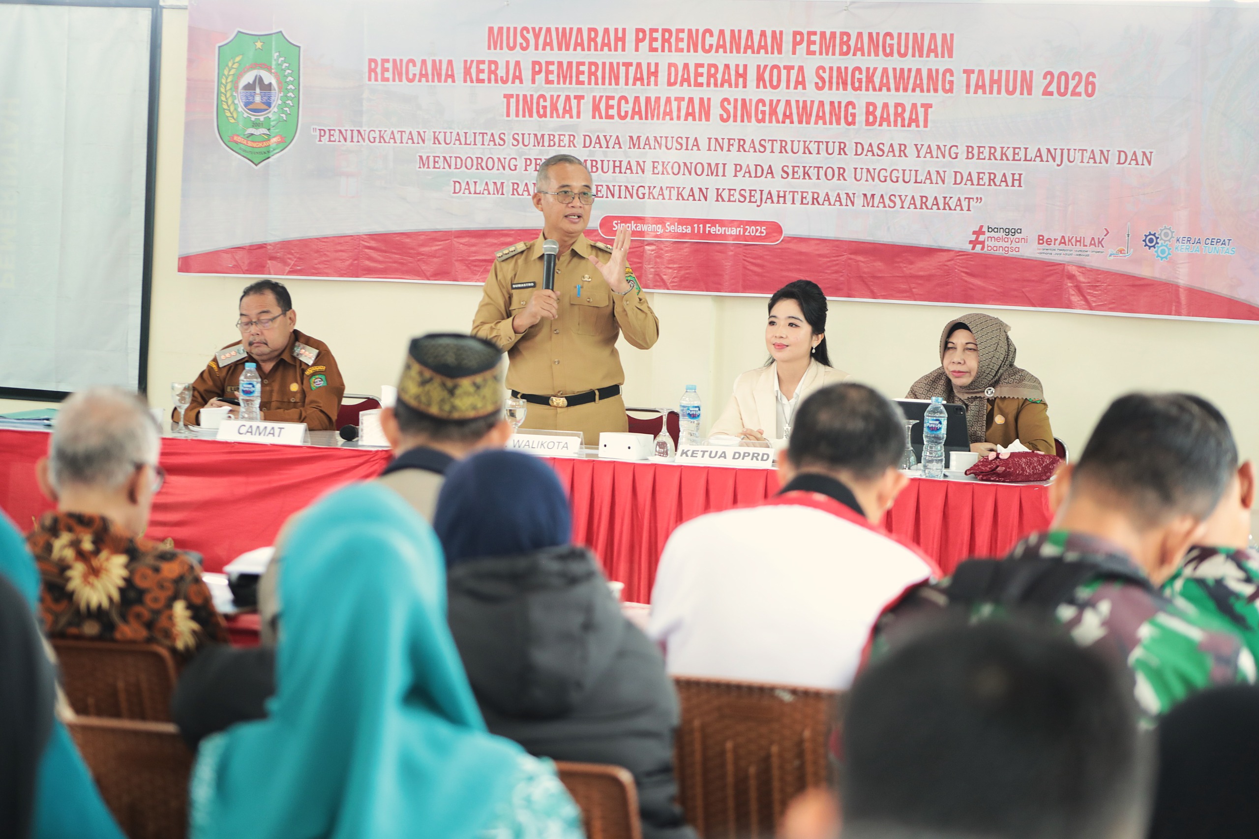 Penjabat Wali Kota Singkawang, Drs. H. Sumastro, M.Si., didampingi Anggota DPRD dan jajaran Kepala Perangkat Daerah terkait, secara resmi membuka Musyawarah Perencanaan Pembangunan (Musrenbang) RKPD tingkat Kecamatan Tahun 2026 di Aula Kantor Kecamatan Singkawang Barat, Selasa (11/02/2025).