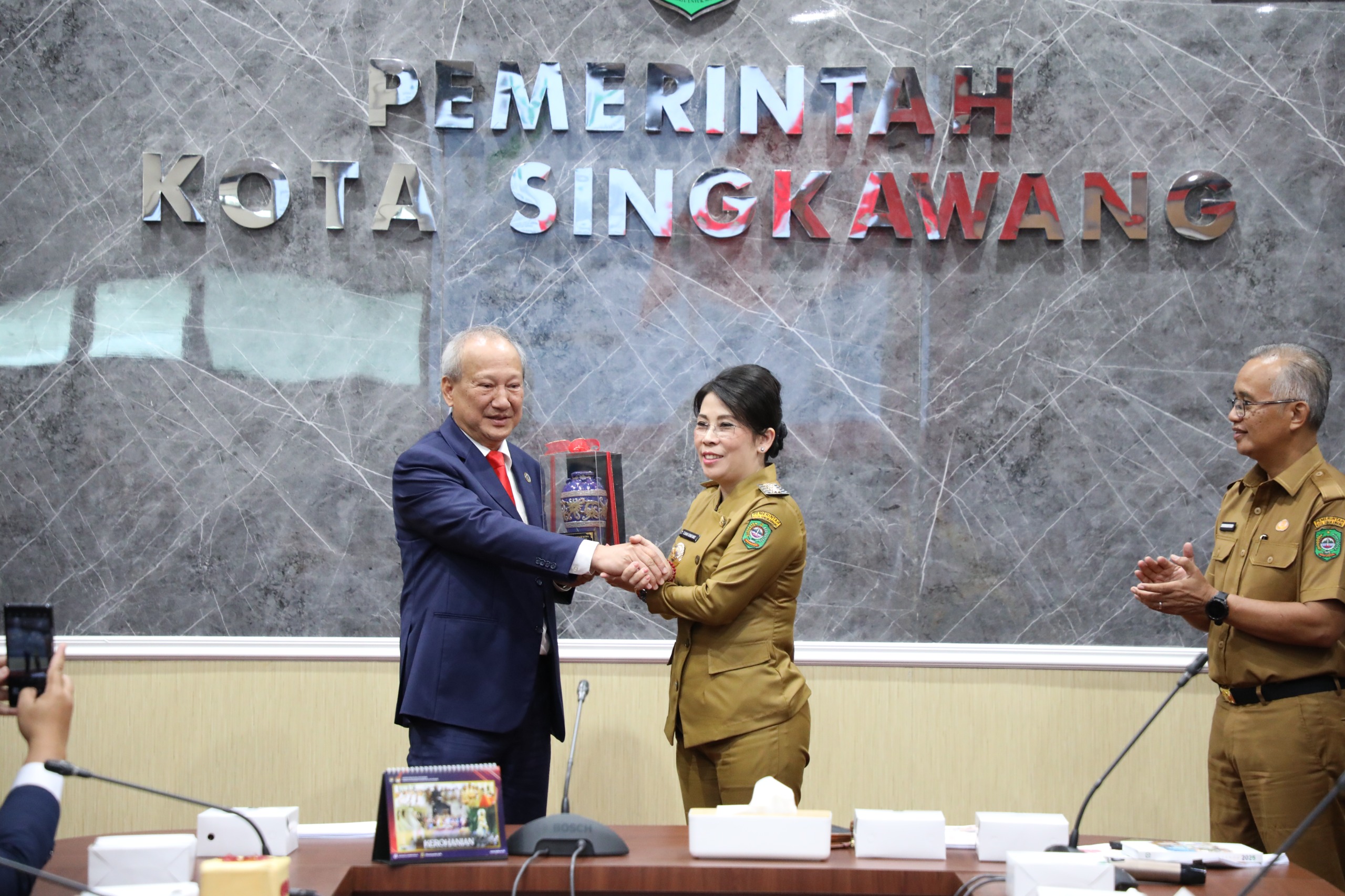 Wali Kota Singkawang, Tjhai Chui Mie (TCM) didampingi Sekretaris Daerah beserta jajaran menyambut kunjungan kerja Secretary Bau District Council, Malaysia di Ruang Rapat Wali Kota, Senin (24/03/2025).