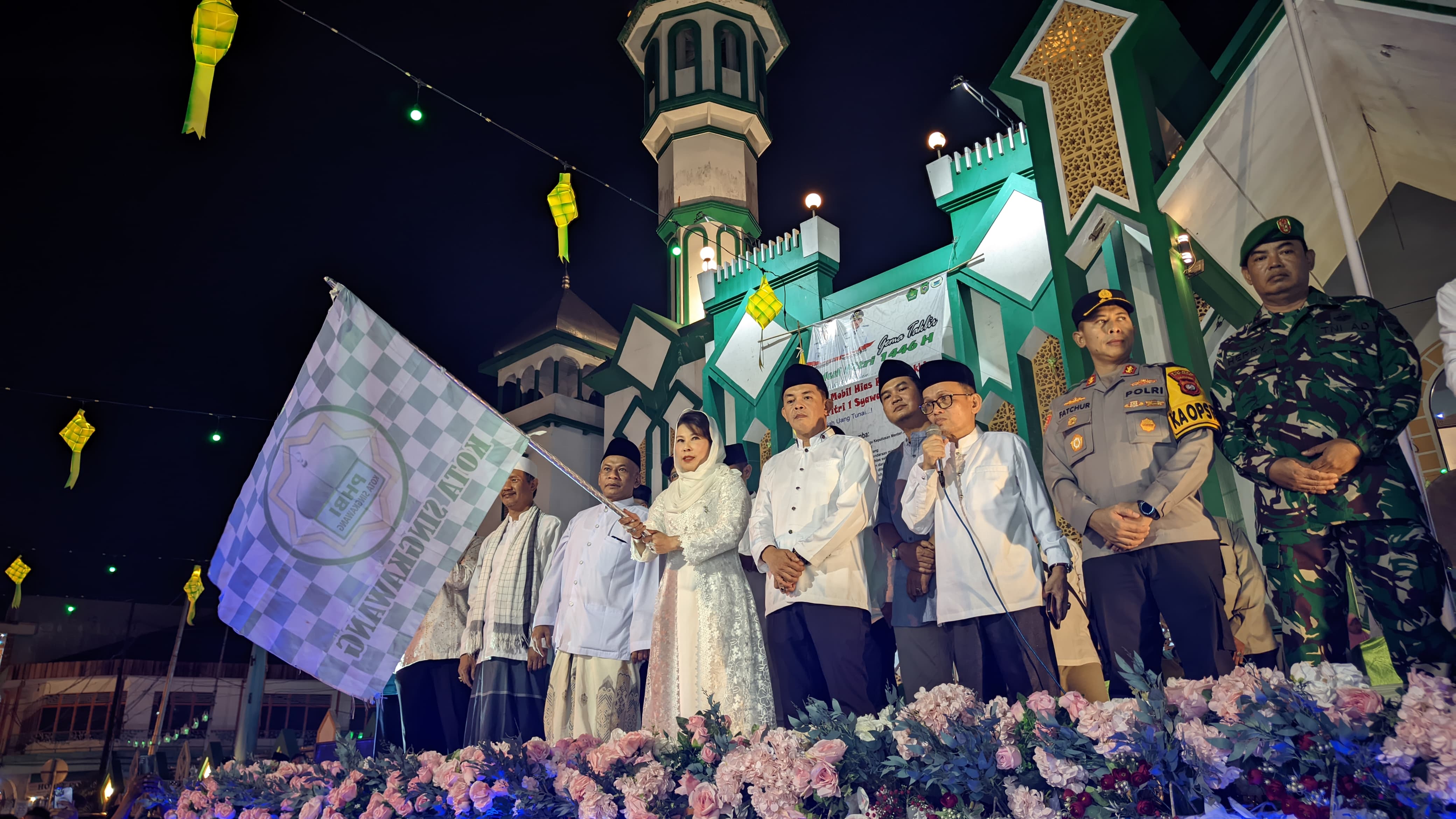 Wali Kota Singkawang, Tjhai Chui Mie, didampingi Wakil Wali Kota, Muhammadin bersama jajaran Forkopimda, melepas puluhan peserta Pawai Takbir dalam rangka menyambut Hari Raya Idul Fitri 1 Syawal 1446 H di depan Masjid Raya Singkawang, Minggu (30/03/2025).