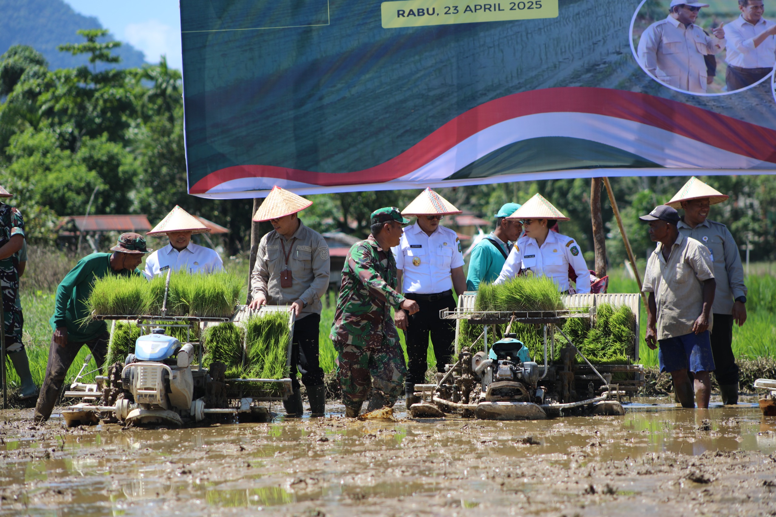 Wali Kota Singkawang Tjhai Chui Mie dan Wakil Wali Kota Singkawang Muhammadin mendampingi Gubernur Kalbar, Ria Norsan Tanam Padi Serentak 14 Provinsi bersama Presiden RI yang digelar Kementerian Pertanian, berlokasi di lahan milik Poktan Hidup Baru Jalan Raya Singkawang-Bengkayang, Kelurahan Pajintan, Singkawang Timur, Rabu (24/04/2025).