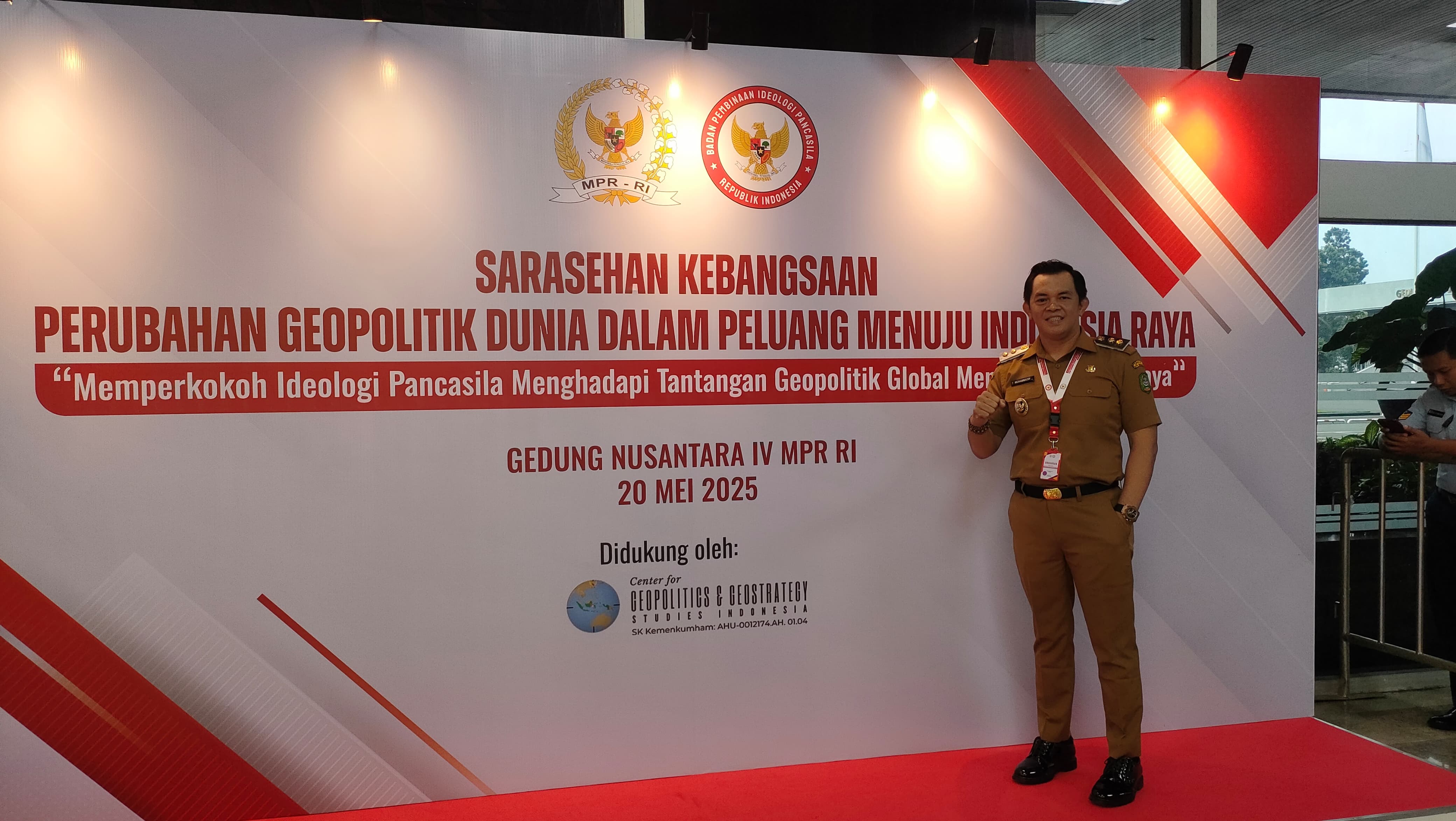 Wakil Wali Kota Singkawang, Muhammadin, mewakili Wali Kota Singkawang menghadiri kegiatan Sarasehan Geopolitik Nasional yang diselenggarakan oleh MPR RI bekerja sama dengan Badan Pembinaan Ideologi Pancasila (BPIP) dan dan Center for Geopolitics & Geostrategy Studies Indonesia (CGSI) bertempat di Ruang Nusantara IV Gedung MPR RI Jakarta Pusat, Selasa (20/05/2025).