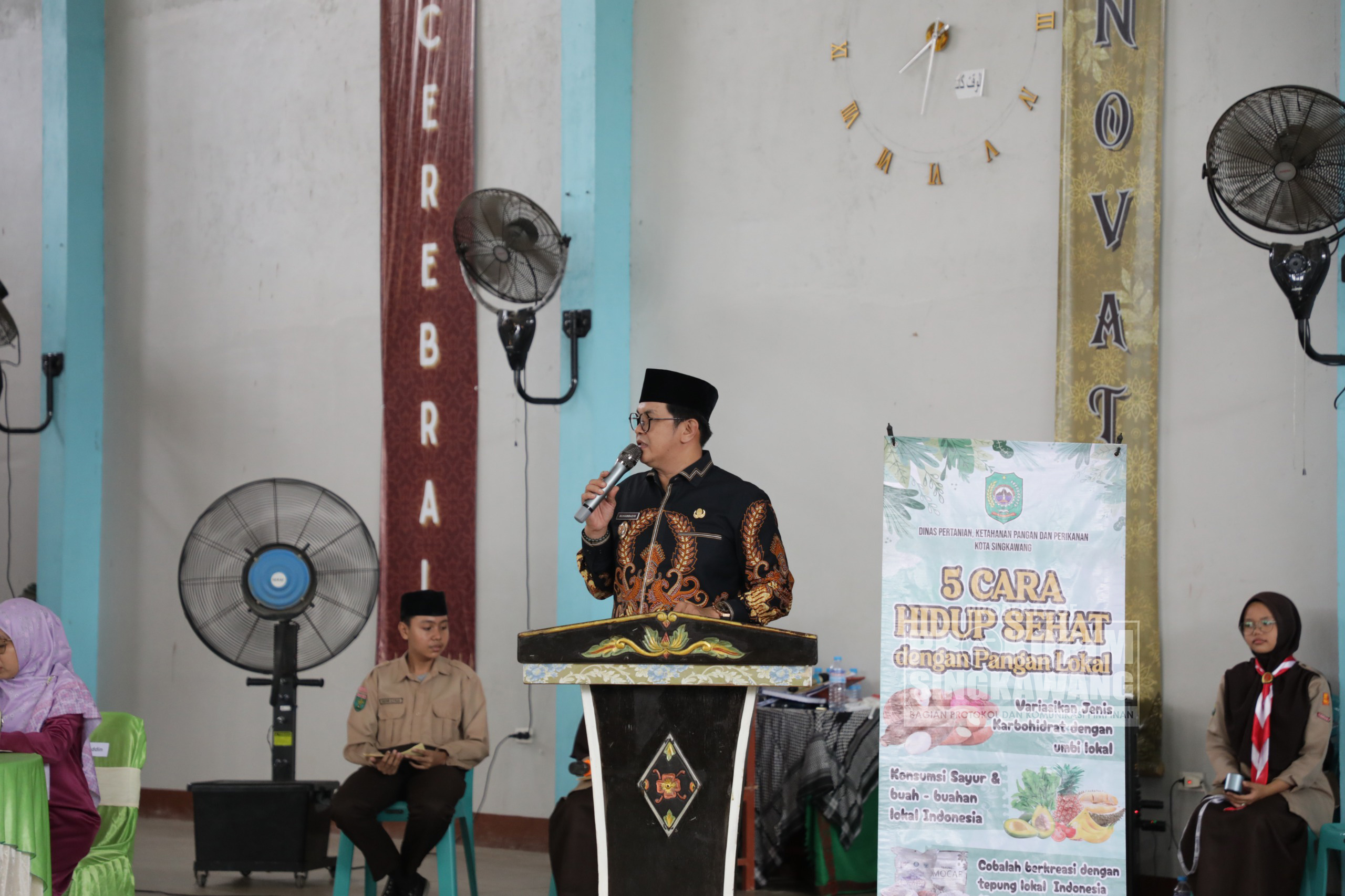Wakil Wali Kota Singkawang, Muhammadin, menghadiri kegiatan sosialisasi dan edukasi konsumsi pangan Beragam, Bergizi, Seimbang, dan Aman (B2SA) yang digelar di Gedung H.B. Rasnie Terpadu Center Ma’hadi, Pondok Pesantren Pembangunan Ushuluddin Singkawang, pada Kamis (09/10/2025).