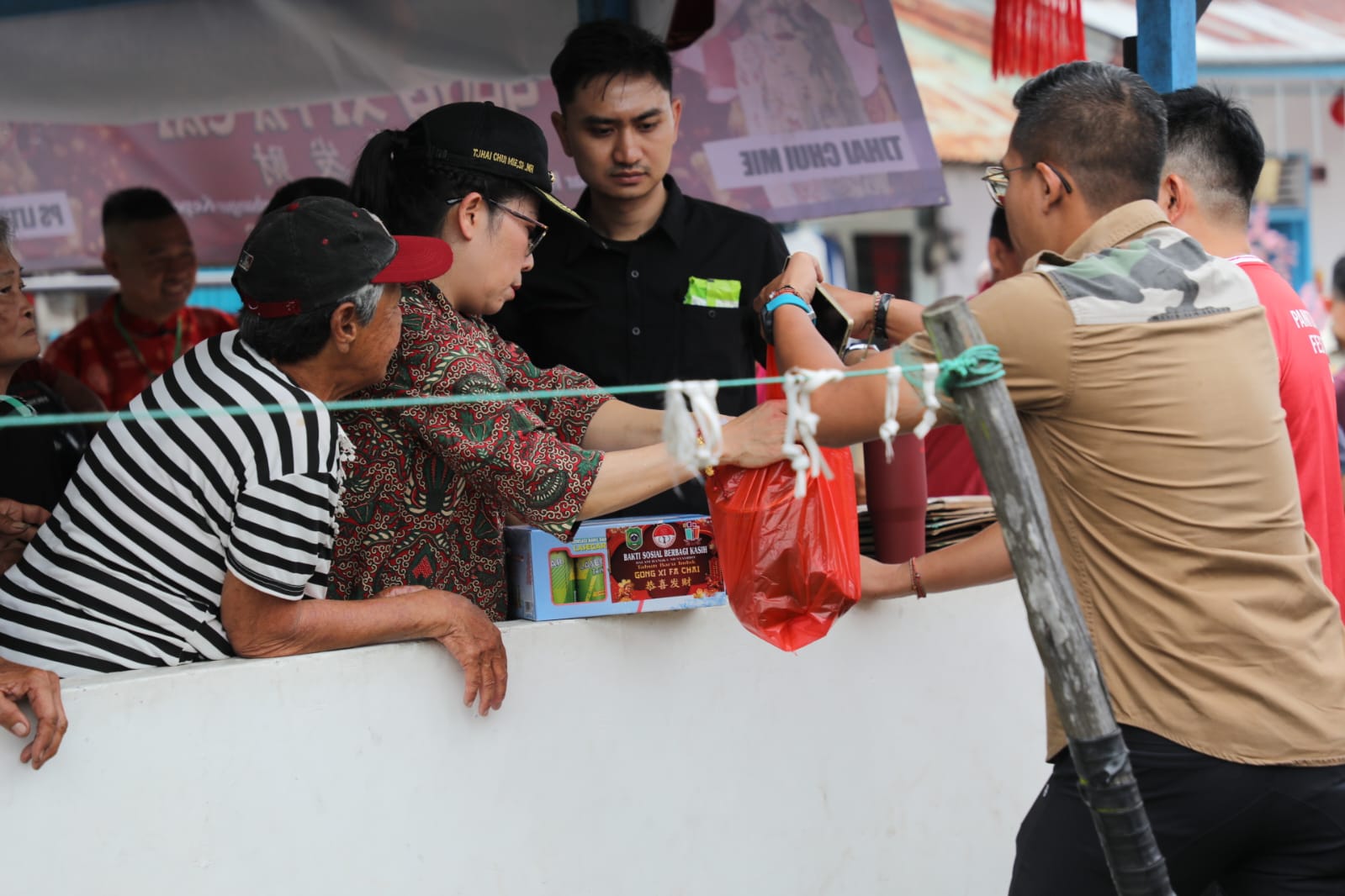 Wali Kota Singkawang, Tjhai Chui Mie bersama Tim Hakka Singkawang serta relawan dan donatur dari Care City Church membagikan paket Imlek dalam kegiatan bakti sosial bertajuk Berbagi Kasih yang digelar di Jalan KS Tubun Gang Harmonis Kelurahan Roban, Kecamatan Singkawang Tengah, pada Jumat (13/02/2026).